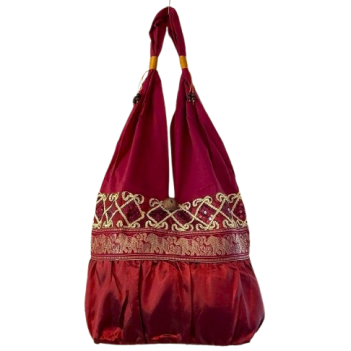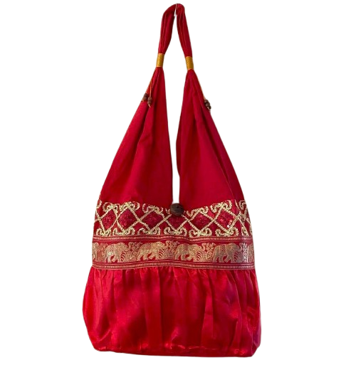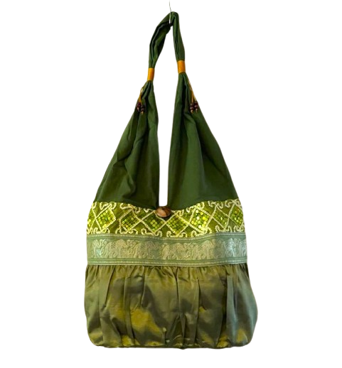 Has small wooden beads on each side of the handle, inside pocket and wooden or coconut shell button closure.Each Item in individually made so slight differences may occur.