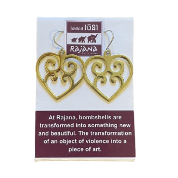 These earrings although classic in design have a unique story. One of Rajana’s most significant projects has been the creation of the Bombshell range of jewellery. The Bombshell Jewellery is crafted from old artillery shell casings that have been gathered up from around the Cambodian countryside and the Mekong River.