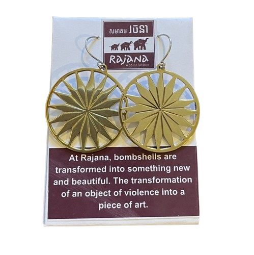 These earrings although classic in design have a unique story. One of Rajana’s most significant projects has been the creation of the Bombshell range of jewellery. The Bombshell Jewellery is crafted from old artillery shell casings that have been gathered up from around the Cambodian countryside and the Mekong River.