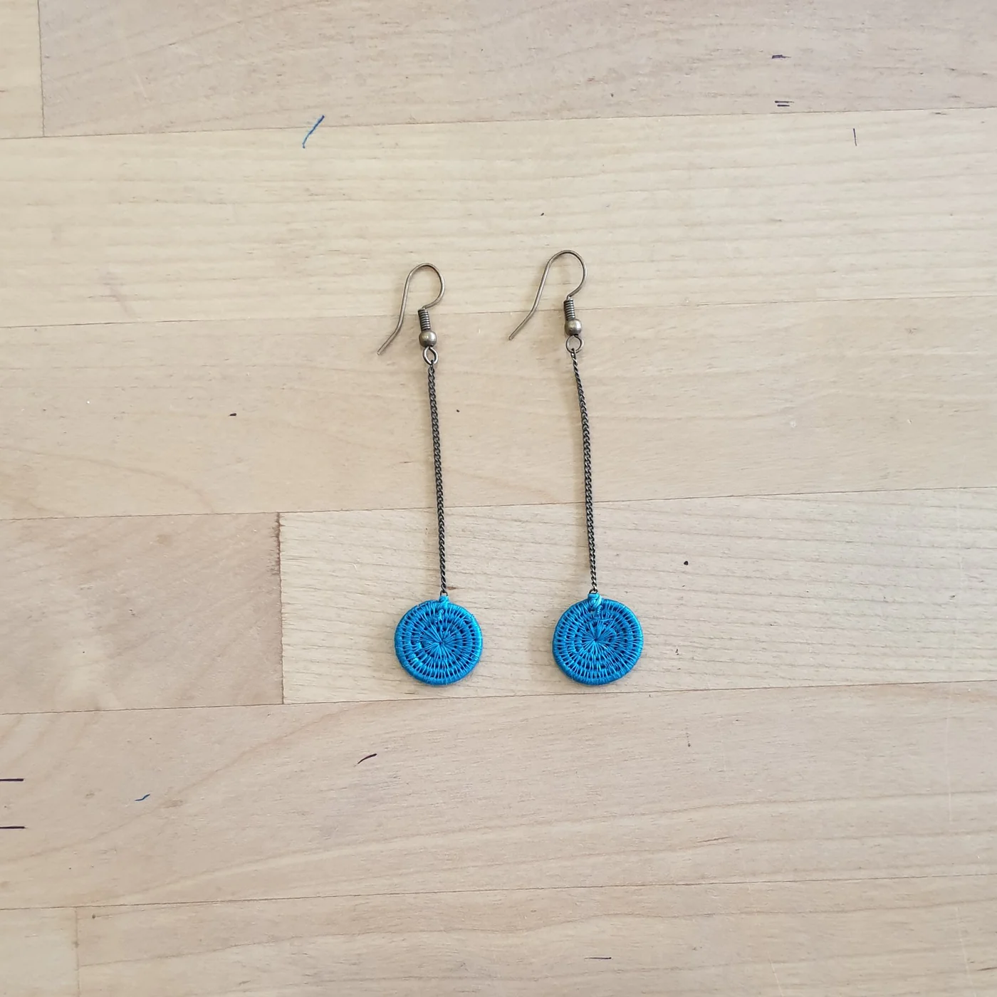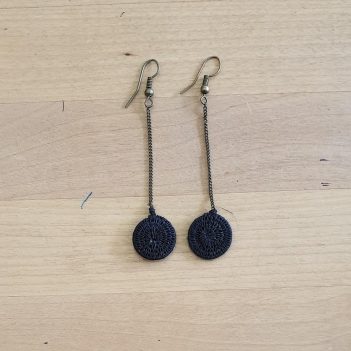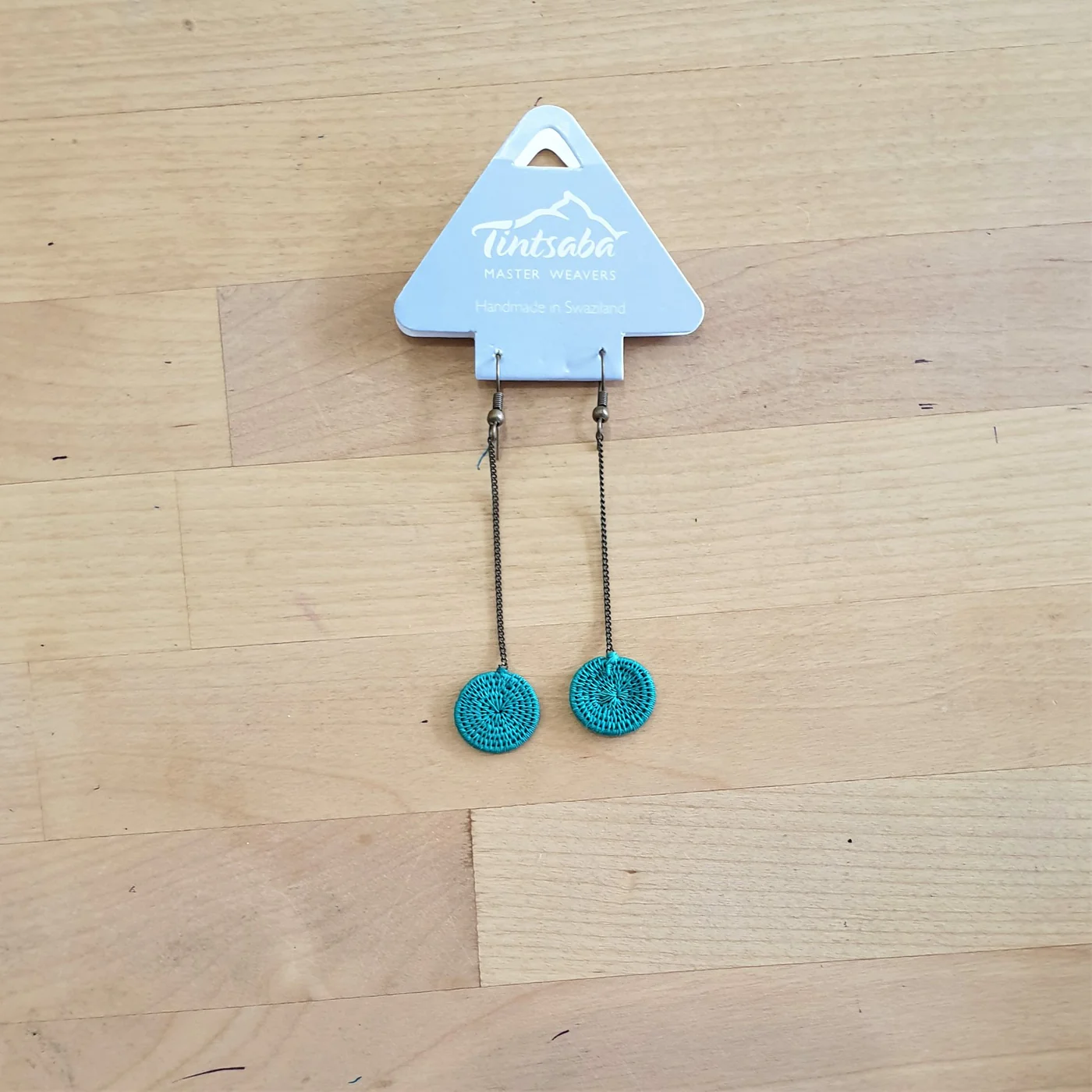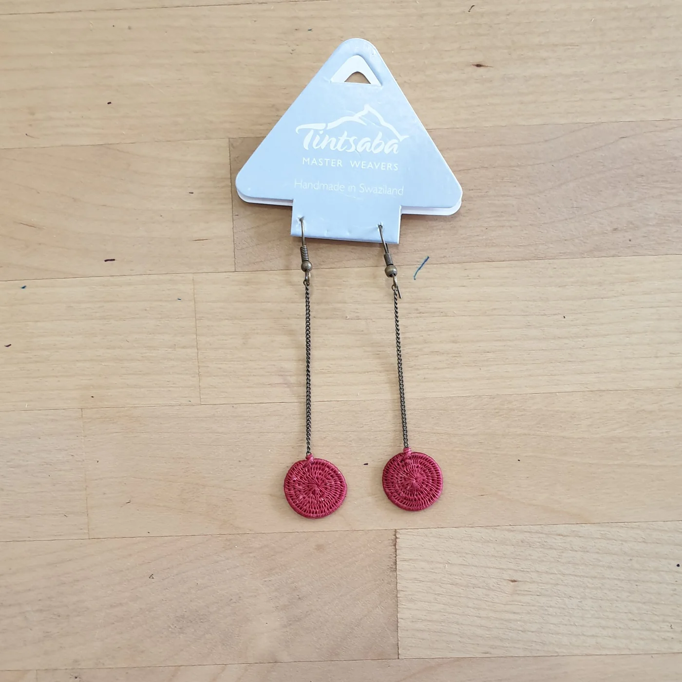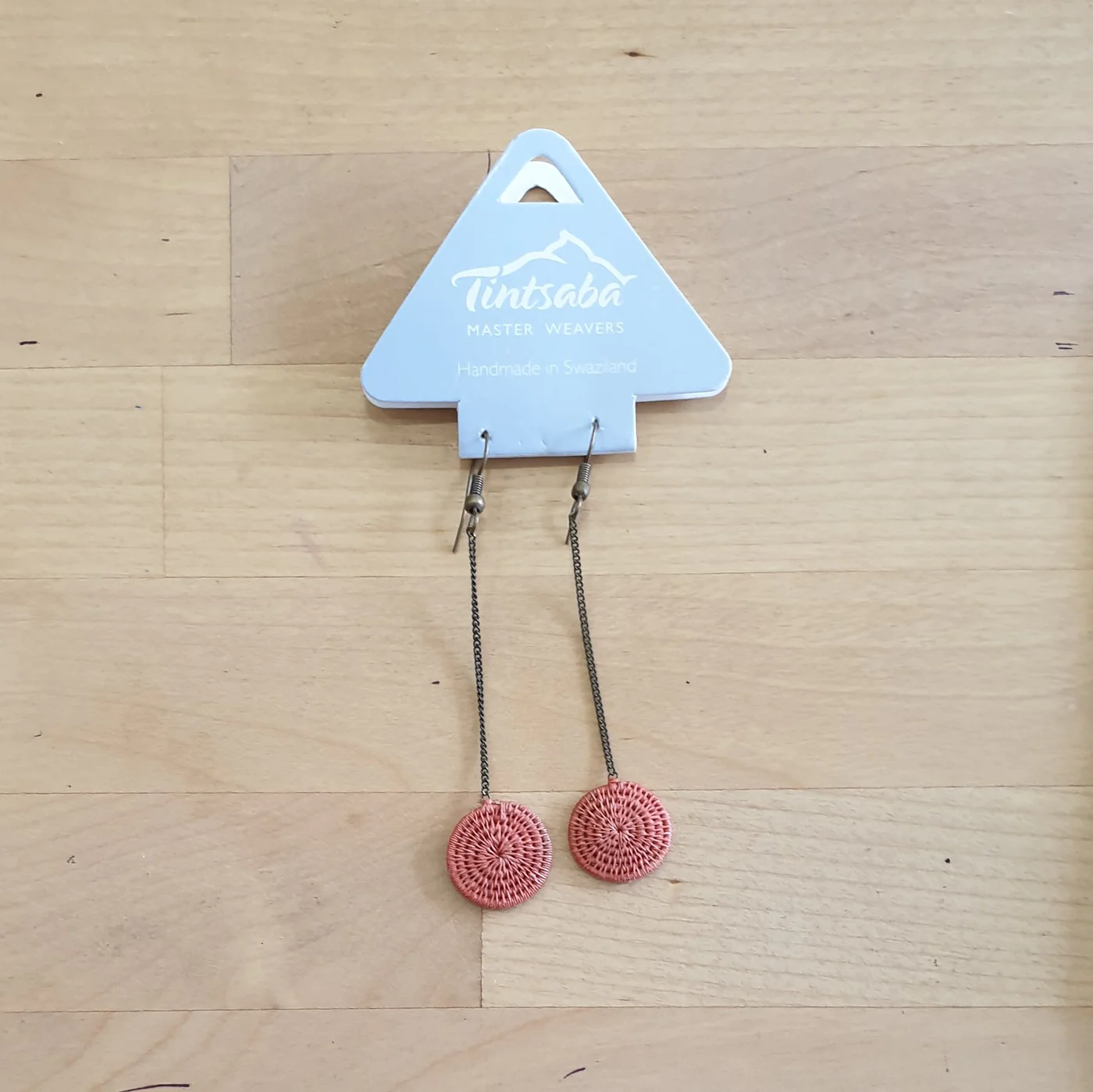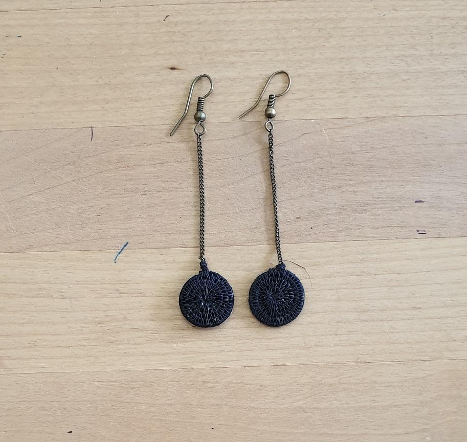 Our new brass drop earrings feature Tintsaba tightly woven discs on a 7 cm drop brass chain.