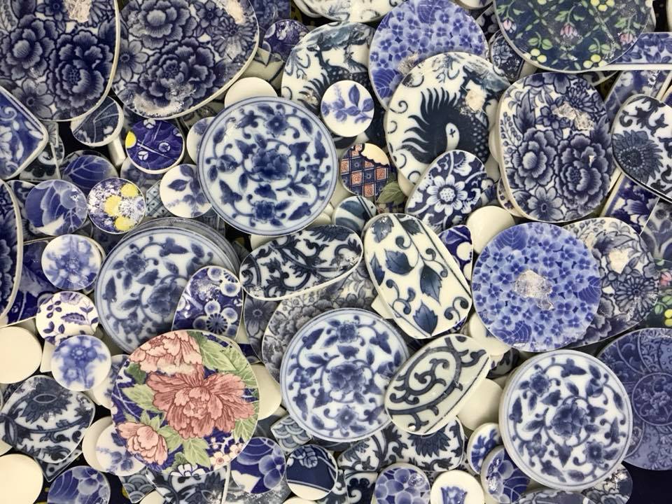 Vintage pieces of Japanese Porcelain are shaped and laid into shaped re-claimed Hardwood pieces, each one very unique.
