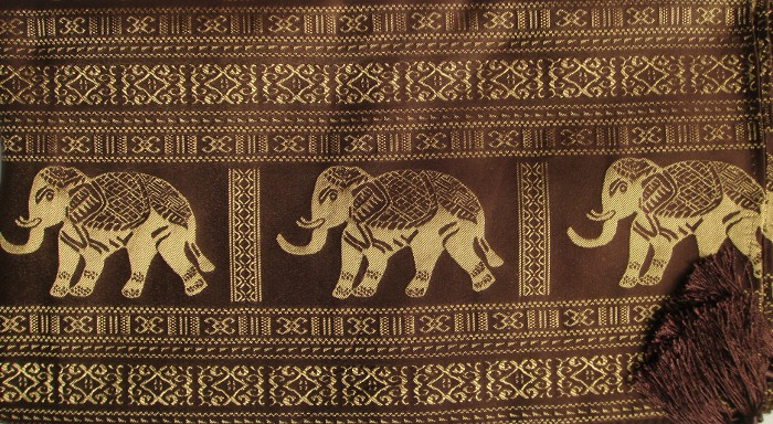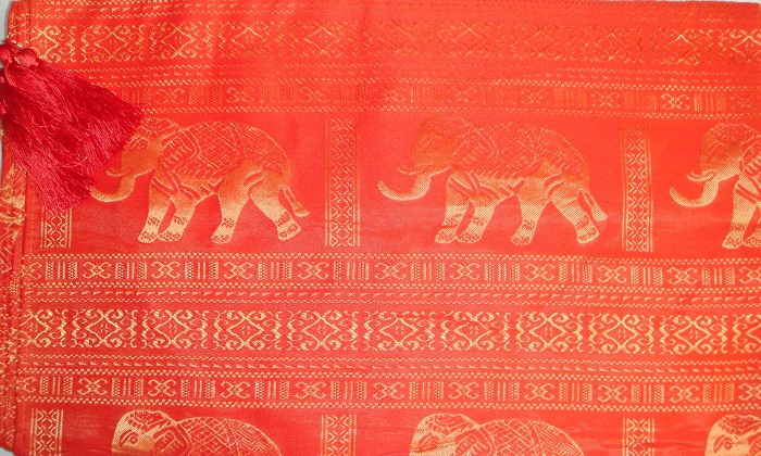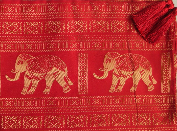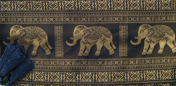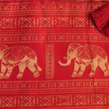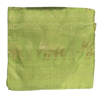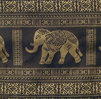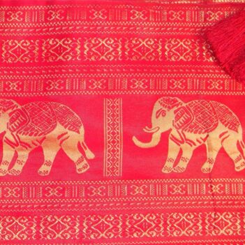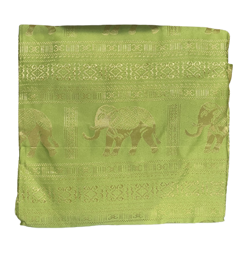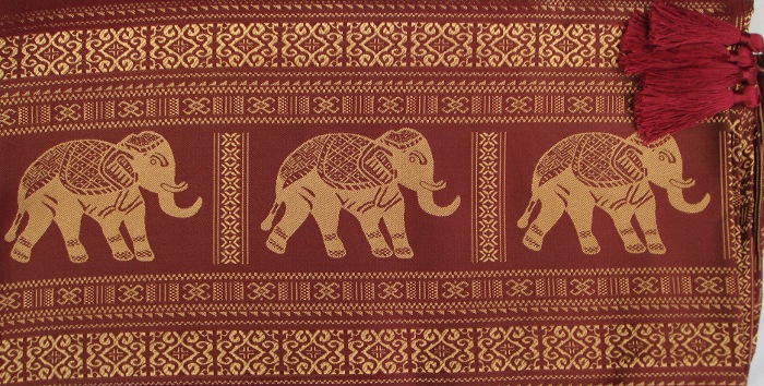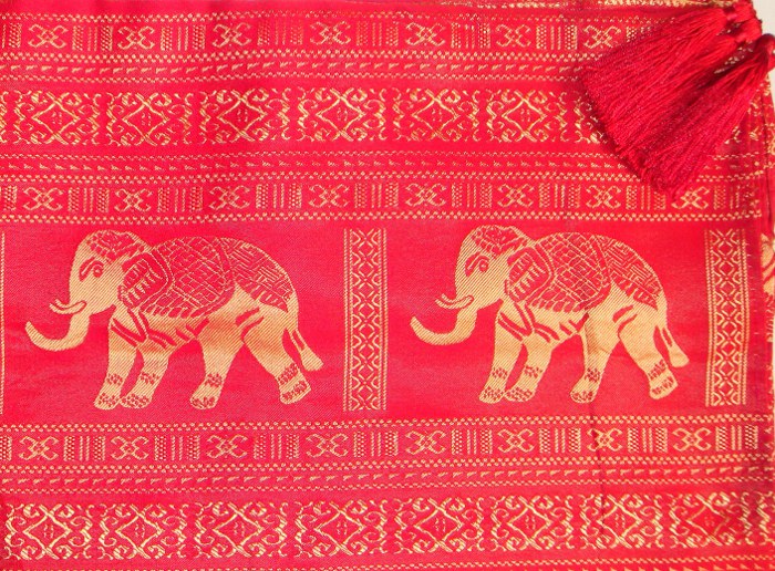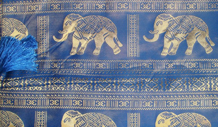 Each colour is woven with gold colour silk thread to form the pattern of the Elephant Design. Materia; is a Cotton Silk Blend.