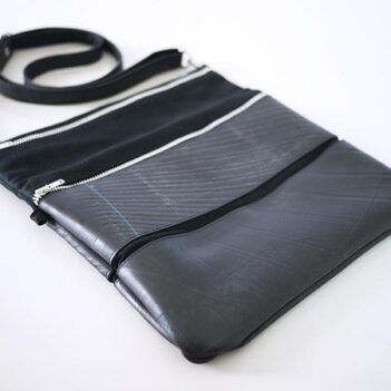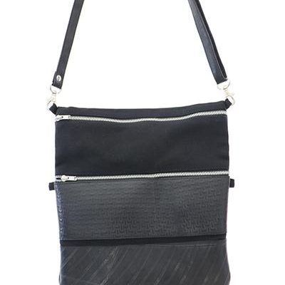 Is lined with black canvas and has 2 zipper details with a long adjustable shoulder strap