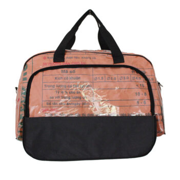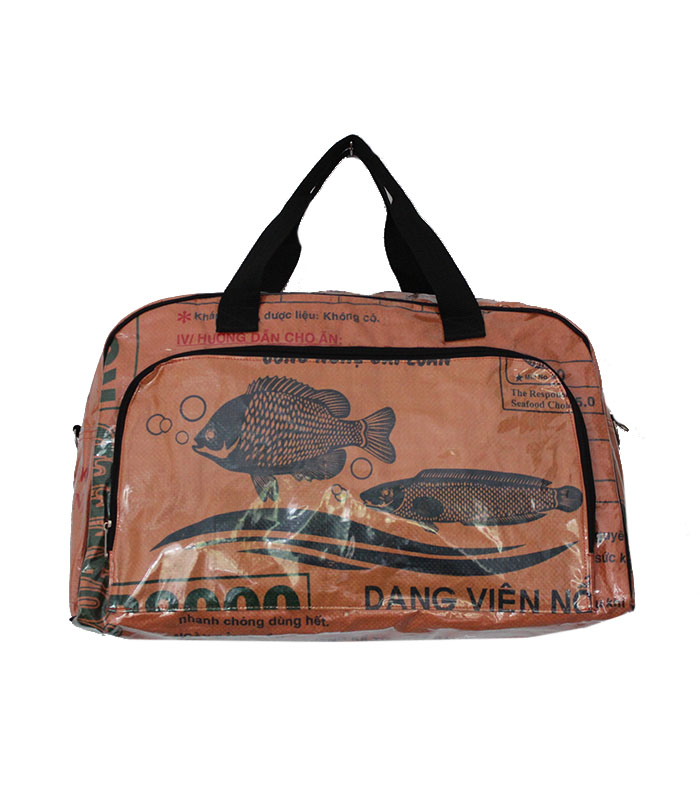 The material used are Fish Feed Bags that are washed, cut and sewn into various designs.