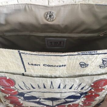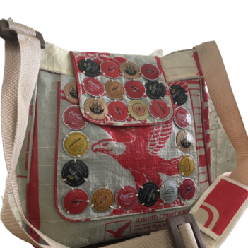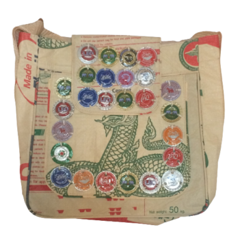 This cool Shoulder Bag is made from Recycled Cement Bags and Soda and Beer Bottle Tops.