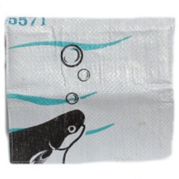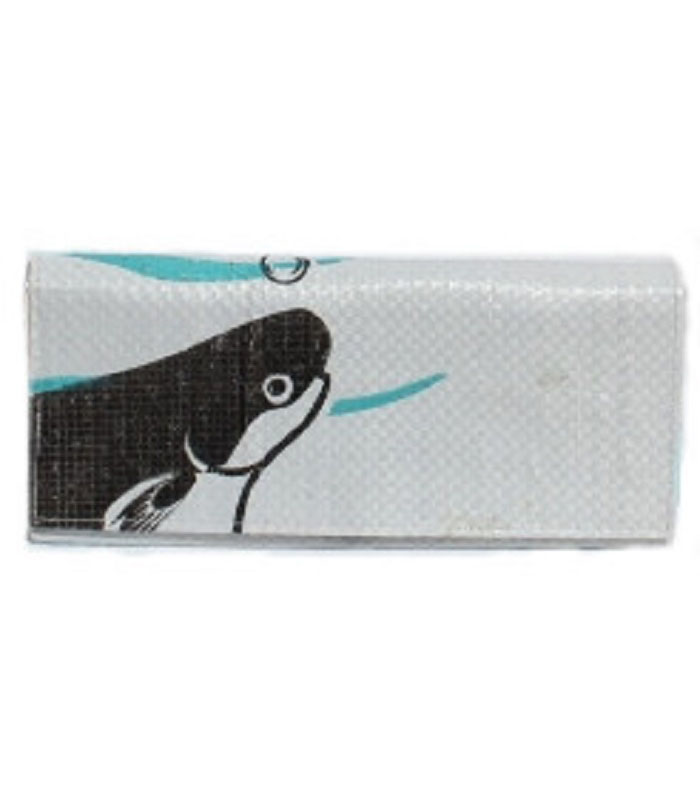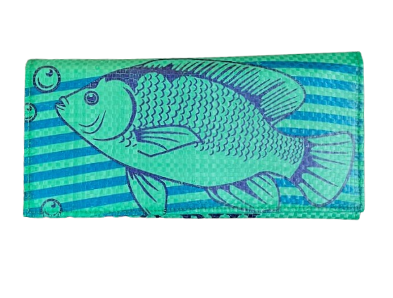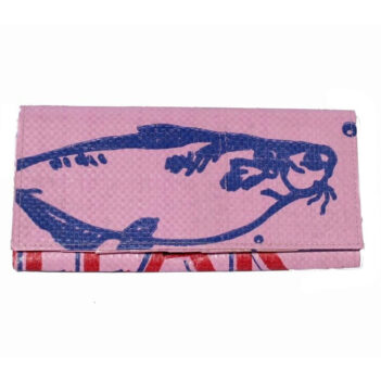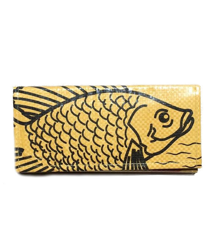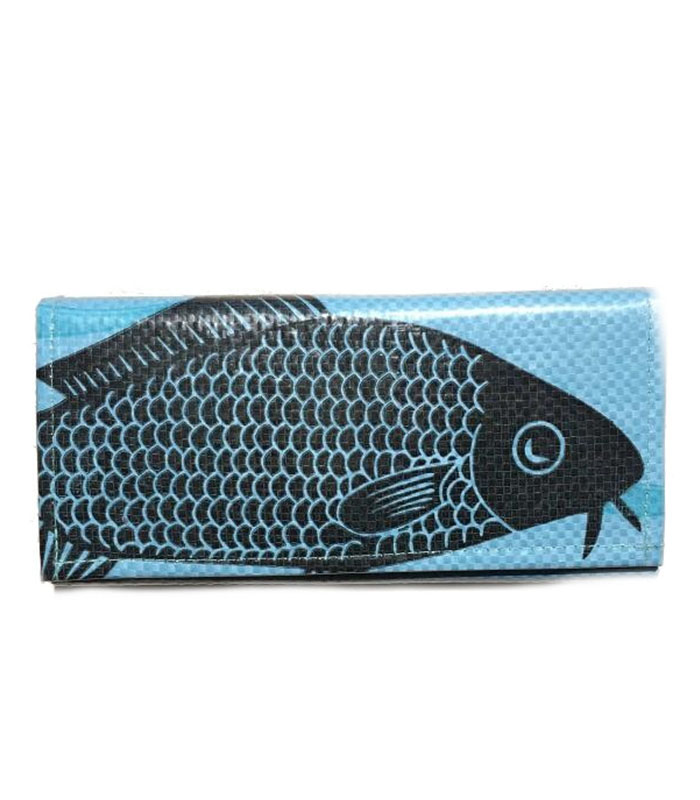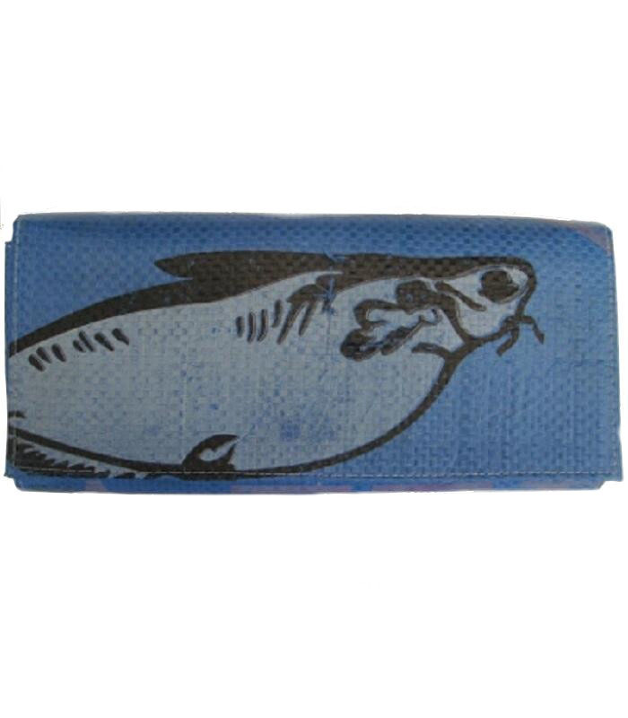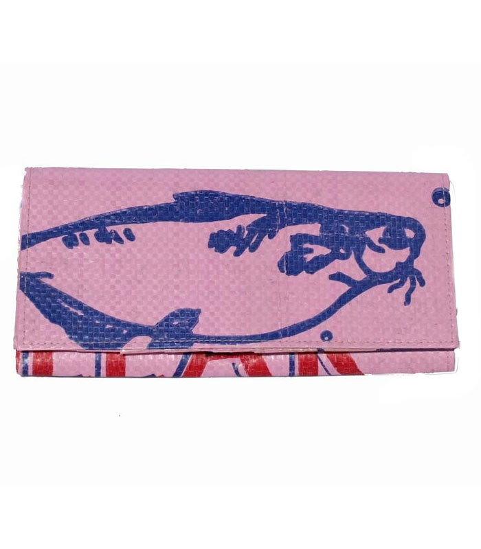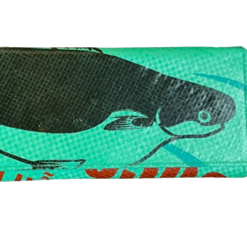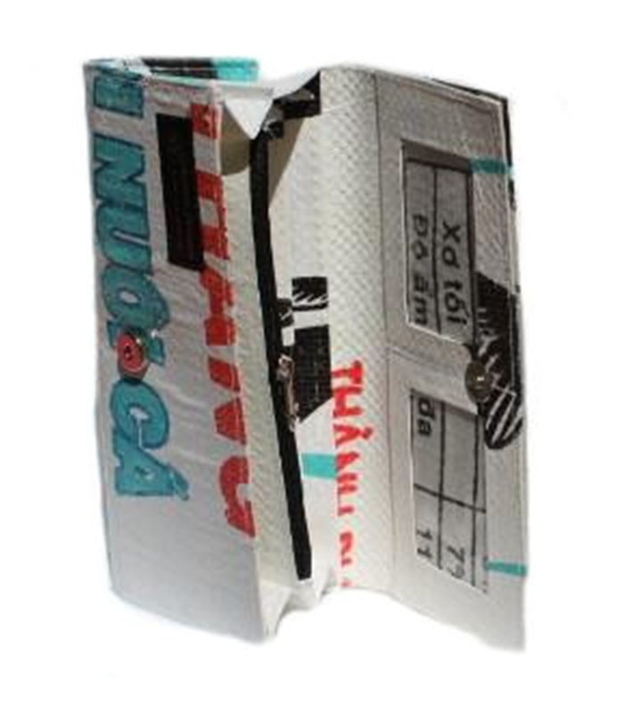 This cool Ladies wallet is made in Cambodia for Recycled Fish Feed Bags by Landmine Victims.