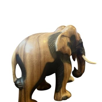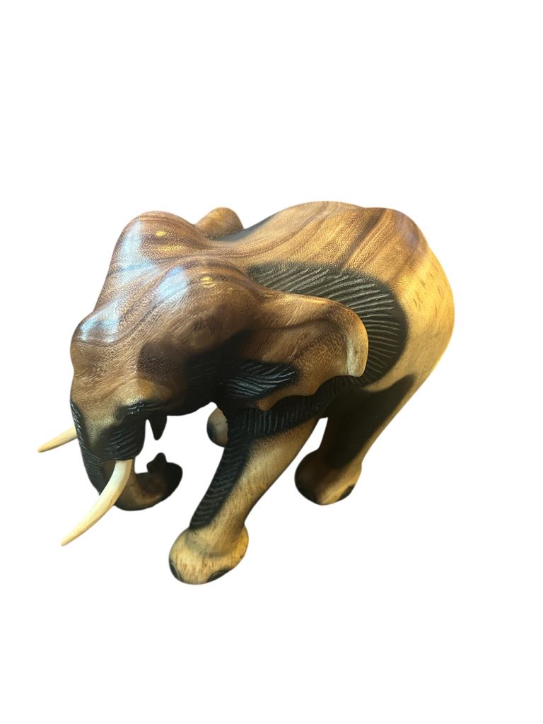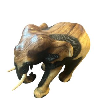 Each piece is individually hand carved, so differences in wood grain will appear. Has been coloured, polished and treated. Tusks are removable and are made from plastic or Mango wood in larger sizes. Tusks are 5cm long.